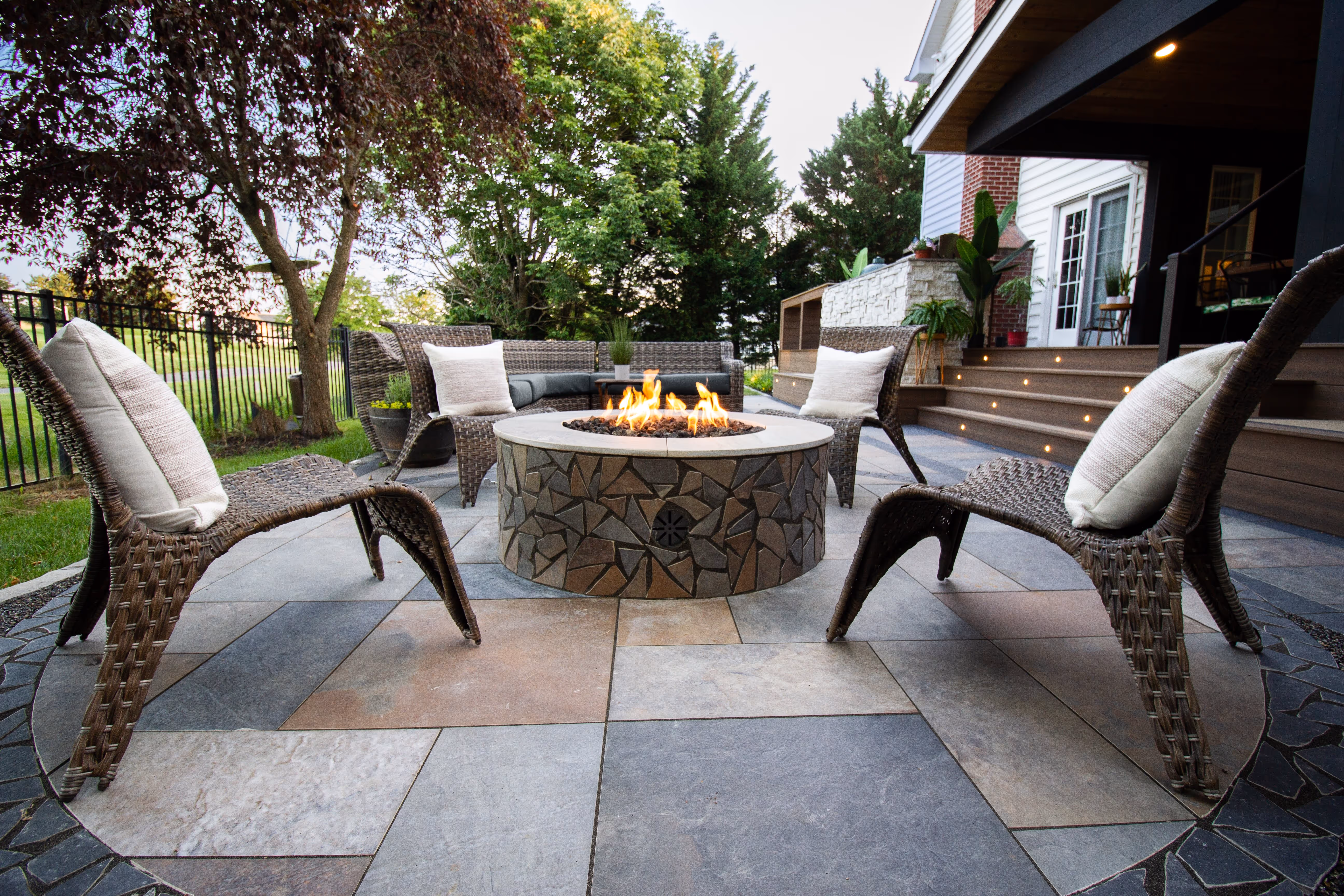 You’d think taking on the challenge of a simple porcelain installation would be enough the first time out. But, Sean is all about creativity, and he wanted to explore what he could do with it. In addition to cutting curves, he took a hammer to it and used the pieces to create a mosaic inlay in the pavers and a veneer for the fire pit. They also used porcelain for the countertop on the grill island and for the top of the fire pit which meant cutting more curves.