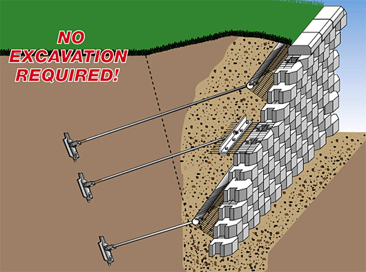 Bart has also used earth anchors to build taller walls without geogrid. There are helical earth anchors that screw into the ground. But, the most common earth anchors are like supersized toggle bolts you might use to hang a picture on a hollow wall. "You drive a rod into the soil behind the wall to the depth you want, and then pull back on the rod and the head flips open like a toggle bolt, and that engages the soil to lock it in place."Common earth anchors are driven in with a hammer or a jack hammer every 2' to 4'. If you hit boulders or bed rock, you pre-drill the holes with a horizontal drill rig. Once installed, you use a load testing tool to ensure to earth anchors won't pull out.While earth anchors greatly reduce the need for excavation, you do need a subsurface easement if the anchors are driven into a neighboring property.
