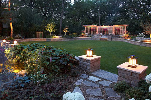 One feature the homeowners didn't plan on but happily added after a demonstration was outdoor lighting. The space really comes alive at night, and the lighting extends the useful season of the backyard. After almost 3 months of construction, the new backyard was ready for the homeowners to entertain and enjoy warm summer nights outdoors under soft lights.