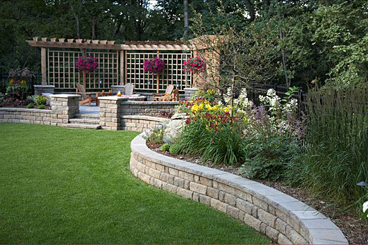 Retaining walls make it possible to turn the hillside into a spacious lawn with a raised patio and an entertainment area.