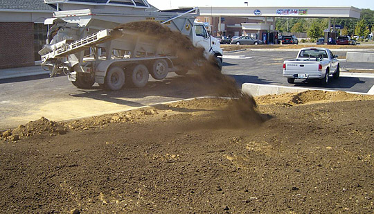 A good operator can spray material extremely evenly across an area. "The company we work with [Syracusa Sand & Gravel, Victor, NY] has spectacular operators. We've had them spread topsoil for us too. We didn't even have to rake when they were done. It's incredible. It's like spray painting the earth brown with dirt."